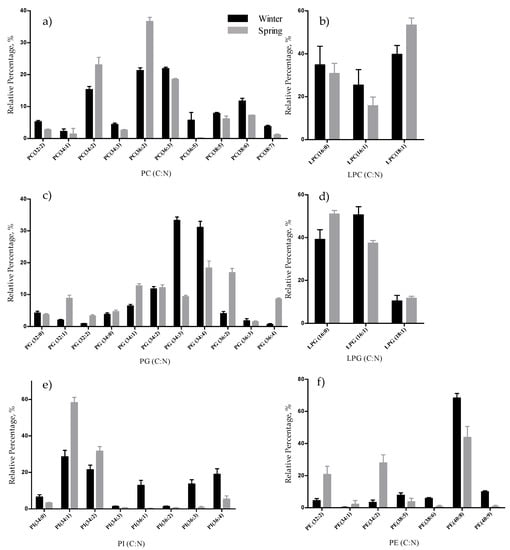 Relative abundance (RA) of molecular species of phospholipids identified in F. vesiculosus collected in winter (February) and spring (May), determined by HILIC LC-MS: (a) PC; (b) LPC; (c) PG; (d) LPG; (e) PI; and (f) PE molecular species. Numbers in parentheses (C:N) indicates the number of carbon atoms (C) and double bonds (N) in the fatty acid side chains. The species with higher relative abundance in each class were: PC (36:2) and PC (36:3), LPC (18:1), PG (34:4), PG (34:3), PG (36:2), LPG (16:1), PI (34:1), PI (34:2), and PE (40:8).