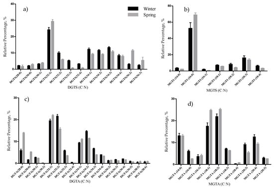 Relative abundance (RA) of molecular species of betaine lipids identified in F. vesiculosus collected in winter (February) and spring (May), determined by HILIC LC–MS: (a) DGTS; (b) MGTS; (c) DGTA; (d) MGTA molecular species. Numbers in parentheses (C:N) indicate the number of carbon atoms (C) and double bonds (N) in the fatty acid side chains. The species with higher relative abundance were DGTS (32:1), MGTS (16:0), DGTA (32:1), DGTA (32:2), MGTA(18:1), and MGTA (18:2).