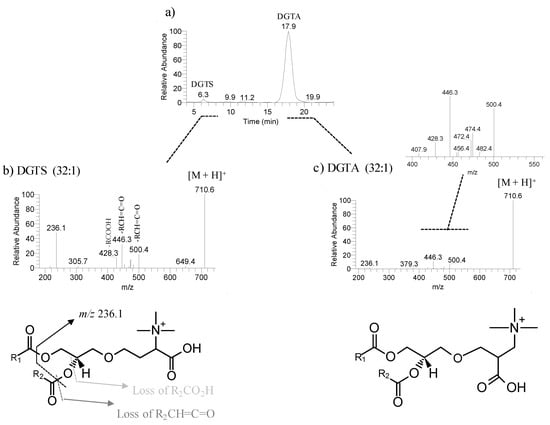 We have also identified 53 molecular species of betaine lipids, distributed by diacylglyceryl hydroxymethyltrimethyl-β-alanine (DGTA, 21 species), and monoacylglyceryl hydroxymethyltrimethyl-β-alanine (MGTA, 10 species), and very low abundant diacylglyceryl-N,N,N-trimethyl-homoserine (DGTS, 15 species), and monoacylglyceryl-N,N,N-trimethyl-homoserine (MGTS, 7 species), (Table 3, Supplementary information Figure S6). These betaine lipids included molecular species with FA chain lengths ranging from C14 to C20 and the degree of unsaturations from 0 to 5. The most abundant molecular species were DGTA (32:1) and DGTA (32:2), MGTA (18:1); MGTA (18:2), DGTS (32:1) and MGTS (16:0) (Figure 4, Table 3). DGTA are well-known betaine lipids in Fucus sp., while DGTS are usually identified in the green and red macroalgae, as reported for example for Codium tomentosum [38], Chondrus crispus [37], Gracilaria sp. [39] and Porphyra dioica [40]. The classes DGTA and MGTA are structural isomers of DGTS and MGTS and were identified based on the LC retention time and in the manual interpretation of the MS/MS data (Supplementary information Figures S10–S12). The retention times were as follows: DGTA at RT = 16 min (Figure 5a), DGTS at RT = 6 min (Figure 5a), MGTS at RT = 9 min and MGTA at RT = 27 min (Supplementary information Figure S10).