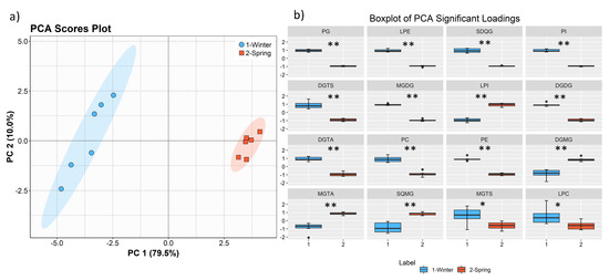 A data matrix was constructed using the lipid classes, calculated from the sum of all molecular species within each class. The principal component analysis (PCA), showed clear discrimination of the two groups from the different seasons, with the eigenvalue of the first principal component representing 79.5% of the total variance (Figure 6a). We sorted lipid classes using the contributions of the significantly different variables in the first principal component, being the most important the PG, LPE, SDQG, and PI classes (Figure 6b).