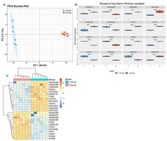 The PCA of the lipid species dataset also showed clear discrimination of the two groups from different seasons (Figure 7a). The eigenvalues of the two first principal components represented 71.6% of the total variance (PC1 64.5% and PC2 7.1%) of the observations. Also, we sorted the molecular species using the q values from the Mann–Whitney U test. Results showed 107 molecular species with significant differences between seasons with q < 0.01 and 12 species with q < 0.05 (Supplementary Table S2). The top 16 molecular species with lower q values included 6 PG, 4 MGDG, 2 DGDG, 2 SQDG, 1 LPG, and 1 SQMG (Figure 7b). Of these, the species that were more abundant in May (spring) than in February were galactolipids MGDG (32:1), MGDG (38:5), MGDG (40:8), and DGDG (38:6), phospholipids PG (32:1), PG (34:1), PG 36:2, and PG 36:4, and sulfolipid SQMG (16:0). The species that were more abundant in February (winter) than in May (spring) were MGDG (36:8) and DGDG (38:6), phospholipids PG (34:3), PG (34:4), LPG 16:1 and sulfolipids SQDG (32:2), and SQDG (32:3).