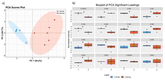 Principal component analysis (PCA) scores scatter plot (PC2 vs. PC1) of lipid (FA) data set acquired by GC-MS of the two groups: winter (February) and spring (May) (a) and boxplot of the FA, sorted (left to right, top to bottom) by contributions in accounting for the variability in the first principal component of PCA (b). Mann–Whitney U test results displayed in box plots showing significant differences between seasons, * q < 0.05.