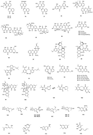 However, aromatic polyketides with diverse biological activities are much more commonly reported from marine-derived fungi. For example, Zhang et al. identified four new tetralone derivatives, including heterodimeric clindanones A (74) and B (75) and homodimeric cladosporols F (76) and G (77) from a deep-sea isolate of the fungus Cladosporium cladosporioides HDN14-342. Cladosporol G displayed good cytotoxicity against HeLa cells, with an IC50 value of 3.9 µM [44]. Eight antifouling and antibacterial polyketides (78–85), including two previously unreported examples, 6,8,5′,6′-tetrahydroxy-30-methylflavone (78) and paecilin C (79), were isolated from the gorgonian coral-associated fungus Penicillium sp. SCSGAF 0023. Compounds 78 and 83–85 displayed antifouling activity against larvae settlement of Balanus amphitrite, with EC50 values of 6.7–17.9 µg/mL, while compounds 80–82 showed antibacterial activity against four bacterial strains [45]. A study on the fermentation broth of the sponge-derived fungus Aspergillus sp. F40 afforded two new polyketides, versiconol B (86) and oxisterigmatocystin I (87), the former compound displayed weak antimicrobial activity against S. aureus and V. parahaemolyticus [46]. Liu et al. reported the isolations of several novel anti-inflammatory polyketides, including a pair of enantiomers (+)- and (−)-ascomindone D (88,89), which incorporate a novel 2,3-diaryl indone moiety, and two new prenylated polyketides ascomfurans C (90) and ascomarugosin A (91), from the mangrove-derived fungus Ascomycota sp. SK2YWS-L. The enantiomers displayed anti-inflammatory activities, while also inhibiting the production of NO with IC50 values of 17.0 and 17.1 µM, respectively [47]. Polyketides that were sourced from marine fungi have also proved useful in research on immunosuppressive agents. In a 2016 report, a group of polyketides (92–100), including two new benzophenone derivatives, peniphenone (92), and methyl peniphenone (93), were obtained from the mangrove endophytic fungus Penicillium sp. ZJ-SY2. These compounds showed significant immunosuppressive activity, with IC50 values ranging from 5.9 to 9.3 µg/mL [48].