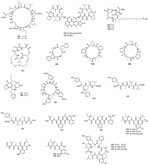 Marine bacteria could produce diverse peptides, which are a group of compounds that are composed of amino acids (Figure 4). We have included in this class all compounds that are primarily amino-acid derived, which are not alkaloids. For example, Xiu et al. isolated two pumilacidin-like cyclic lipopeptides (116,117) from the marine-derived bacterium Bacillus sp. 176. Intriguingly, they showed potent motility suppression activity against marine bacterium Vibrio alginolyticus [54]. Many of the peptide compounds that were derived from marine bacteria displayed remarkable anticancer and antibacterial activity. Neo-actinomycins A and B (118,119), which are two new members of a group of well-known chromopeptides, were obtained from the marine-derived Streptomyces sp. IMB094. Neo-actinomycin A displayed nanomolar cytotoxic activities against human cancer HCT116 and A549 cell lines, with IC50 values of 38.7 and 65.8 nM, respectively. In addition, it also exhibited moderate inhibitory activities against methicillin-resistant Staphylococcus aureus (MRSA) and vancomycin-resistant Enterococci (VRE) strains [55]. Marine-derived Micromonospora chalcea FIM 02-523 afforded three new cyclic depsipeptides, rakicidins G–I (120–122). They were composed of four unusual amino acids, with a long aliphatic chain attaching to the peptide ring. They displayed potent antitumor activities against HCT-8 and PANC-1 cancer cell lines under hypoxic conditions and also showed antibacterial activities against a panel of bacteria, with MIC values ranging from 0.125–8 µg/mL. Amongst them, rakicidin G was the most effective and it showed very strong antibacterial activity against Peptostreptococcus anaerobius ATCC 27337, with an MIC of less than 0.125 mg/mL [56]. Zhou et al. identified a highly cytotoxic depsipeptide, chromopeptide A (123), from the marine sediment-derived bacterium Chromobacterium sp. HS-13-94, which exhibited inhibitory activity against HL-60, K-562, and Ramos cells, with IC50 values of 7.7, 7.0, and 16.5 nmol/L, respectively [57].