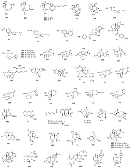 Chemical investigation on the culture extract of sponge-associated fungus Hansfordia sinuosae afforded six new caryophyllene-type sesquiterpenoids that possess a unique bicyclo[2.7.0]undecane skeleton, named punctaporonins H–M (240–245). Among them, punctaporonins K showed potent lipid-lowering activity that could reduce the intracellular levels of triglycerides and total cholesterol [89]. Another sponge-derived fungus Aspergillus sp. afforded four new antibacterial bisabolane-type sesquiterpenoids (246–249). They showed either broad spectrum or selective antibacterial activity against the eight tested bacterial strains [90]. Some sesquiterpenoids also exhibit significant anticancer activities. Fang et al. isolated a highly unusual nitrobenzoyl sesquiterpenoid, 6b,9a-dihydroxy-14-p-nitrobenzoylcinnamolide (250), together with a known analogue, insulicolide A (251), from the marine-derived fungus Aspergillus ochraceus Jcma1F17. These both displayed significant anticancer activity against a panel of cancer cell lines, while 251 also displayed antiviral activities against H3N2 and EV71 [91]. The mangrove-derived endophytic fungus Penicillium sp. J-54 afforded four new eudesmane-type sesquiterpenoids, namely penicieudesmol A–D (252–255). Among them, penicieudesmol B displayed weak cytotoxicity against K-562 cells [92]. Li et al. isolated five new triquinane-type sesquiterpenoids, namely chondrosterins A–E (256–260), from the soft coral-associated fungus Chondrostereum sp. Chondrosterin A showed low micromolar cytotoxic activities against the cancer lines A549, CNE2, and LoVo [93].