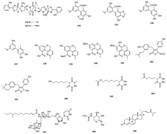 Marine microbes have also been shown to produce compounds that cannot easily be assigned to a particular structure class; these are briefly discussed here. In a 2018 report, Sun et al. isolated a group of butenolide derivatives, including two new compounds (342,343) from a marine sponge-derived fungus Aspergillus terreus. They displayed potent inhibitory activities against α-glucosidase [117]. Chemical investigation of culture extract of another marine fungus, Aspergillus niger, led to the discovery of three new itaconic acid derivatives, namely asperitaconic acids A–C (344–346). They showed inhibitory activity against Staphylococcus aureus, with MIC values of 16–32 μg/mL [118]. Tunicamycin E (347), a new nucleoside antibiotic, along with six analogues, was obtained from the marine-derived Streptomyces xinghaiensis SCSIO S15077. They displayed moderate antifungal activity against two Candida albicans strains, and very strong inhibitory activity against Bacillus thuringiensis, with MIC values of 0.008–2 μg/mL [119]. Huang et al. obtained one 1-deoxy-N-acetylglucosamine compound (348) from a marine bacterium Virgibacillus dokdonensis MCCC 1A00493 isolated from deep-sea polymetallic nodules. It displayed significant inhibitory activity against Xanthomonas oryzae pv. oryzae, which is a pathogenic bacteria causing rice bacterial blight [120]. In a few instances, the reports describe the isolation of new compounds from multiple structure classes: Chen et al. isolated six steroid derivatives, including a new one (349), together with five butyrolactone derivatives, from a gorgonian-derived fungus Aspergillus sp. Some of them showed antifouling activity against larval settlement of the barnacle Balanus amphitrite and antibacterial activity against Staphylococcus aureus [121].