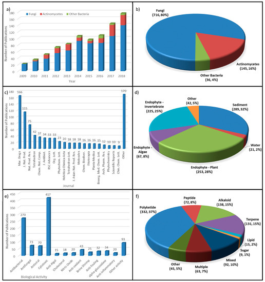 Analysis of publications analyzed in this review. (a) Number of publications each year, split my organism type; (b) percentage breakdown of publications by organism type; (c) publications by journal; (d) percentage of publications by sample collection location; (e) number of publications for each biological activity; and, (f) percentage of publications by structure class of new/active compounds.