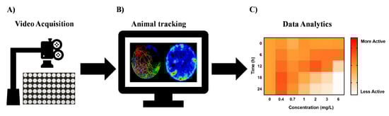 Key enablers for high-throughput chemobehavioural assays in neuroactive drug discovery. (A) Ultra-high-throughput video data recording systems to capture changes of behavioural phenotypes upon stimulation with chemical agents. (B) Automated animal tracking software capable of high-throughput data analysis from hundreds of samples. The organism’s behaviour is identified against the background of the vessel and run through quantifying tracking algorithms. (C) Systems-level phenotypic analytics to allow digitization of the behavioural traits into simpler biological fingerprints, phenotypic clustering, and elucidation of mechanism of actions.