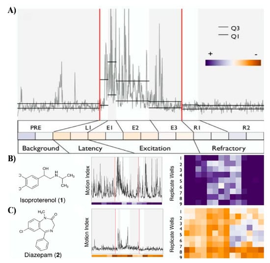 Photomotor response (PMR) assay performed on embryonic stages of zebrafish is an innovative high-throughput paradigm for discovery of new neuroactive chemicals. (A) Digital barcoding of stereotypic PMR responses from a representative untreated sample. The motion index profile was digitized into four phases spanning seven discrete periods: PRE, L1, E1, E2, E3, R1, R2. The 14-digit code formed the behavioural barcode used for the clustering of phenotypes. Colors in the heat map represent deviation from the average control phenotype: purple, higher activity; orange, lower activity. (B) Exposure to a psychostimulant, Isoproterenol, demonstrates increased embryo activity in PMR assay. (C) Exposure to an anxiolytic, Diazepam, demonstrates decreased embryo activity in PMR assay. Reprinted from [] by permission of Springer Nature, Nature Chemical Biology.