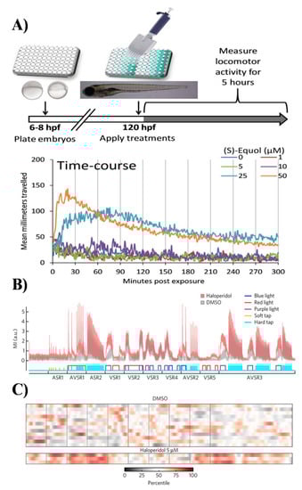 Interestingly, despite common applications of LPR, very little development has actually been made in utilizing other sensorimotor assays such as combination of LPR, sensitivity to temperature (thermotaxis), vibration/touch (thigmotaxis), chemical gradients (chemotaxis), and phototaxis (Figure 5) [,,]. It is anticipated that to generate rich behavioural profiles that can resolve complex and subtle differences between new neuroactive compounds, development of more advanced multidimensional phenotyping will be required [,,]. In this regard, the recent work Bruni et al. has laid foundations for a battery of high-throughput behavioural assays to systematically quantify effects of neuromodulatory compounds on vertebrate motor activity [,]. The authors developed a test battery including two acoustic stimulus responses assays, five visual stimulus response assays and three assays that combined acoustic and visual stimulus responses. This multidimensional behavioural assay elicited robust and reproducible patterns of behavioural phenotypes in larval zebrafish treated with a set of known psychiatric drugs such as antipsychotics, antidepressants, and anxiolytics [,]. The reproducibility of behavioural phenotypes could be used to generate motion index (MI)-based fingerprints. The proof-of-concept of this approach was further demonstrated in discovery of antipsychotics and their mechanisms of action by screening a library of 24,760 compounds [,]. The library included 4,300 known bioactive compounds and 20,000 uncharacterized compounds with over 5,000 DMSO controls. The results were compiled in the first behavioural phenotypic database called PhenoBlast and used for behaviour-based connectivity mapping conceptually related to metrics used in existing fields of bioinformatics [,].