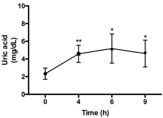 Uric acid (UA) levels at different time points in potassium oxonate and hypoxanthine (PO/HX)-induced acute hyperuricemic rats. Blood samples were collected before inducing the hyperuricemia model (PO: 300 mg/kg; HX: 300 mg/kg) at the first time point (0 h) as the baseline. At the 4th, 6th, and 9th time points after the hyperuricemia model was induced, blood samples were collected from the tail vein at different time intervals. Values are presented as the mean ± SEM (n = 9) (* p < 0.05, ** p < 0.01) and were determined by paired t-test.