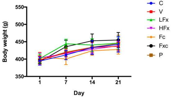 Hyperuricemia was induced three weeks after the onset of the fucoxanthin and fucoidan interventions. The results showed that there was no significant difference in body weight between groups for the same time periods, as shown in Figure 2.