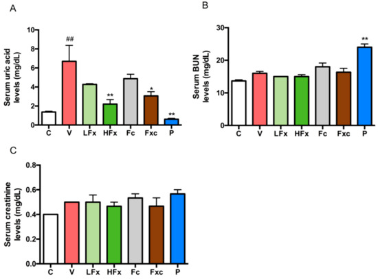 Effects of fucoxanthin and fucoidan on (A) serum UA, (B) serum blood urea nitrogen (BUN), and (C) serum creatinine in hyperuricemic rats. Values are presented as the mean ± SEM (n = 3–5). #p < 0.05, ##p < 0.01 versus control group. *p < 0.05, **p < 0.01 versus vehicle group. C, control group; V, vehicle group (PO: 300 mg/kg + HX: 300 mg/kg); LFx, low-dose fucoxanthin group (Fx: 150 mg/kg); HFx, high-dose fucoxanthin group (Fx: 300 mg/kg); Fc, fucoidan group (Fc: 150 mg/kg); Fxc, low-dose fucoxanthin (Fx: 150 mg/kg) + fucoidan group (Fc: 150 mg/kg); P, positive control group (ALL: 20 mg/kg).
