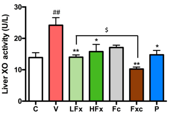 Effects of fucoxanthin and fucoidan on XO activity in liver of hyperuricemic rats. Values are presented as the mean ± SEM (n = 3). #p < 0.05, ##p < 0.01 versus control group. *p < 0.05, **p < 0.01 versus vehicle group. $p < 0.05 versus low-dose fucoxanthin group. C, control group; V, vehicle group (PO: 300 mg/kg + HX: 300 mg/kg); LFx, low-dose fucoxanthin group (Fx: 150 mg/kg); HFx, high-dose fucoxanthin group (Fx: 300 mg/kg); Fc, fucoidan group (Fc: 150 mg/kg); Fxc, low-dose fucoxanthin (Fx: 150 mg/kg) + fucoidan group (Fc: 150 mg/kg); P, positive control group (ALL: 20 mg/kg).