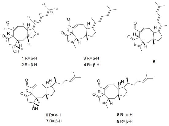 Ophiobolins are a group of sesterpenoids with an unusual tricyclic 5-8-5 ring system. They show a broad range of inhibitory activities against nematodes, fungi, bacteria and cytotoxic activity against cancer cells [,]. They are produced by the fungal genus Bipolaris, Aspergillus, Sarocladium and Drechslera []. The first ophiobolin, ophiobolin A, was isolated from Biolaris spp. and displays inhibitory activity against calmodulin-activated cyclic nucleotide phosphodiesterase []. These findings made the compound a useful calmodulin probe for research purposes and implied an application in anti–cancer therapy []. Interestingly, more than half of the 49 ophiobolins identified between 1999 and 2016 exhibit cytotoxic activities against human cancer cell lines []. Although their biological properties have been well exploited in recent years, their structure-activity relationship remains unestablished []. Consequently, this study focused on the discovery of bioactive natural products from marine fungi. During our ongoing investigation for new bioactive compounds from marine microorganisms, the fungal 168ST-16.1 strain was isolated from the seaweed Padina sp. collected at Da Nang, Vietnam, and, based on its 28S rRNA gene sequence, it was identified as Aspergillus flocculosus. Subsequent chemical investigations on an EtOAc extract of the fungal culture broth using reversed-phase HPLC led to the isolation of the five new ophiobolins, named, 14,15-dehydro-6-epi-ophiobolins K and G (1 and 3), 14,15-dehydro-ophiobolins K and G (2 and 4) and 14,15-dehydro-(Z)-14-ophiobolin G (5), together with four known ophiobolins, 6-epi-ophiobolins C and N (6 and 8) and ophiobolins C and N (7 and 9) [,,] (Figure 1). Herein, details of the structure elucidation and biological activity of these compounds are described.