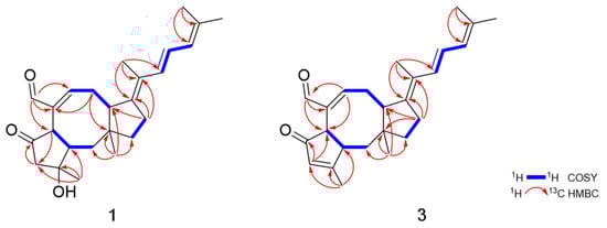 Key COSY and HMBC correlations of 1 and 3.