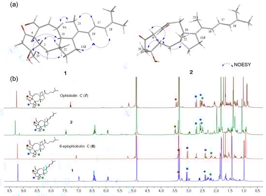 The stereochemistry of 1 was determined by the analysis of proton-proton coupling constants and NOESY data. The strong NOESY correlations of H-6/H-10 and H-2/H3-20/H3-22 suggested that H-6 and H-10 were on the same face, and H-2, H3-20 and H3-22 were on opposite faces. Based on a comprehensive literature review, ophiobolin analogs have A/B-cis or A/B-trans isomers at C-2 and C-6 []. It has been reported that H-2 of the 6-epimer having H-6α is shielded by ca. 0.2-0.3 ppm in comparison with the A/B-cis isomer having H-6β []. On the basis of this analysis, the H-2 protons of 1 and 2 were observed at δH 2.19 and δH 2.57, respectively, indicating that 1 has an A/B-trans ring structure. The lack of a NOESY correlation of H-2/H-6 and a comparison of the 1H NMR data of 1 with those of 6-epi-ophiobolin C (6) also supported the fact that the A/B ring junction is trans in 1 (Figure 3). The relative configuration of the side chain was confirmed by comprehensive NOESY and 1H NMR analyses. The NOESY correlations of H-9α/H3-23 and H-13β/H-16 indicated the relative configuration of Δ14,15 was E conformation (Figure 3a). The geometry of the Δ16,17 was confirmed as E by the large coupling constants of H-16 (d, J = 15.3 Hz) and H-17 (dd, J = 15.3, 9.7 Hz) and NOESY correlations of H-13β/H-16, H-17/H3-23 and H-16/H-18. Moreover, a combination of literature review and comparison of the NMR spectral data and spectral properties of 1 with those of 6, suggested that 14, 15-dehydro-6-epi-ophiobolin K (1) has the same absolute configuration of a 5-8-5 core structure in 6-epi-ophiobolin K [,,].