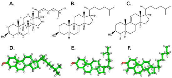 A. Structure of cholesterol (with carbon numbers and stereo position of bonds), the primary sterol in most metazoan cell membranes. B. 5α-Cholest-7-en-3β-ol, the most abundant free sterol of Holothuria scabra. C. 4α,14α-dimethyl-5α-cholest-9(11)-en-3β-ol, the second most abundant free sterol in H. scabra [36]. D,E,F. 3D structure of the sterols [19].