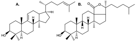 A. Structure of the hypothesized precursor of holothuroid triterpenoids; parkeol. B. The most abundant aglygone moiety in holothuroid triterpene glycosides; holostanol [53,60].