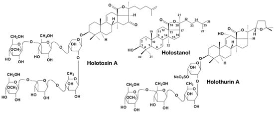 Structures of Holostanol characterized by an 18(20)-lactone fragment. Most sea cucumber triterpene glycosides possess such a type of holostane aglycones. Holotoxin A1 is an example of non-sulfated holostane glycoside. Holothurin A is an example of sulfated holostane glycoside [60].