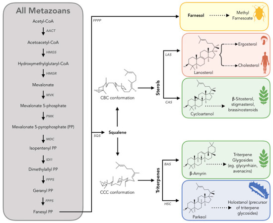 Mevalonate synthesis from acetyl-CoA is conserved in all metazoans (Figure 5, gray box). The final steps of the pathway display group-specific variations: Cholesterol synthesis in vertebrates (Figure 5, orange box) or methyl farnesoate synthesis in arthropods (Figure 5, yellow box) [83]. Once synthesized, 2,3-oxidosqualene can be cyclized by a series of oxidosqualene cyclases (OSCs) to produce sterols: Lanosterol synthase (LAS) in fungi and most metazoan, and cycloartenol synthase (CAS) or triterpenes, e.g., β-amyrin synthase (BAS) in plants (Figure 5, orange, green, and blue boxes).