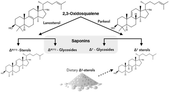 De novo biosynthesis of triterpene glycosides in sea cucumbers was also observed in radiolabeling experiments [90,91]. The radiolabeled acetate and mevalonate were used as precursors for 2,3-oxidosqualene de novo synthesis, which was then usually transformed into lanosterol and parkeol (lanosta-9(11), 24-dien-3b-ol) after cyclization [86,92,93] and also concluded that “all echinoderm classes can form at least some sterols from acetate and mevalonate via the MVA pathway”. However, the authors of [85], through an analysis of the sterol composition and metabolism, suggested that most sterols occurring in echinoderms were formed by transforming exogenous (i.e., dietary) Δ5 sterols. These authors also postulated that there were divergent biosynthetic pathways at the 4,4-dimethyl sterol level, leading either to the Δ7-sterols or to steroidal saponins [85]. However, this remains only a hypothesis.