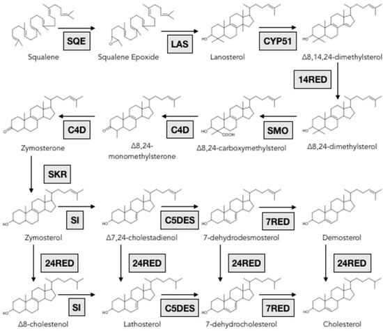 Scheme of the post squalene pathway for cholesterol biosynthesis. SQE: Squalene epoxydase; LAS: Lanosterol synthase; CYP51: Lanosterol-14α-demethylase; 14RED: Sterol-14-reductase; SMO: Sterol-4α-methyl-oxidase; C4D: C4 decarboxylase; SKR: sterone ketoreductase; SI: Sterol-8-isomerase; C5DES: Sterol-C5-desaturase; 24RED: Sterol-24-reductase; 7RED: Sterol-7-reductase. Reproduced with permission from Marijanovic et al., Molecular Endocrinology, published by Oxford University Press (2003), enzymes names were simplified.