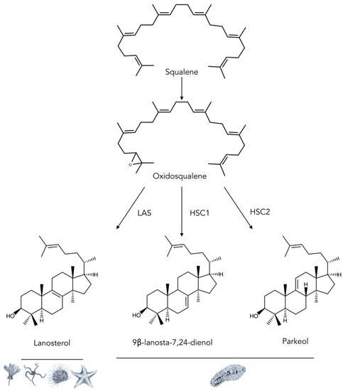 Summary of the diversity of oxido-squalene cyclases (OSCs) in echinoderms. LAS: Lanosterol squalene cyclase is the principal cyclase of the animal kingdom. HSC1 and HSC2: Holothuroid squalene cyclases 1 and 2 are recently discovered cyclase isoforms identified in S. horrens [88] and A. japonicus [89]. In order to unify nomenclature across the literature, holothuroid OSCs were labeled HSC (instead of LAS [104] or OSC [105]). Pictograms underneath the structure illustrate the five classes of echinoderms: Crinoidea, Ophiuroidea, Echinoidea, Asteroidea, and Holothuroidea.