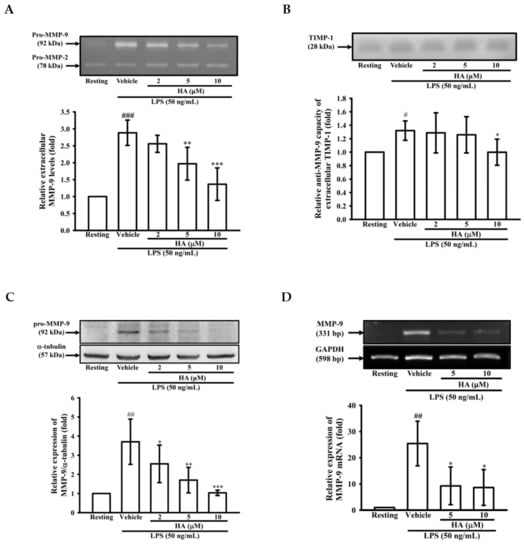 THP-1 cells (5 × 105 cells/0.5 mL), seeding into 24-well plate in RPMI 1640 medium containing 0.5% FBS were pretreated with or without HA for 15 min and were subsequently stimulated with LPS (50 ng/mL) for 24 h, followed by the collection of the supernatants. The extracellular MMPs levels were evaluated by MMP-mediated gelatinolysis via gelatin zymography. TIMP-1 activity was determined via reverse zymography, as previously described [56,57].