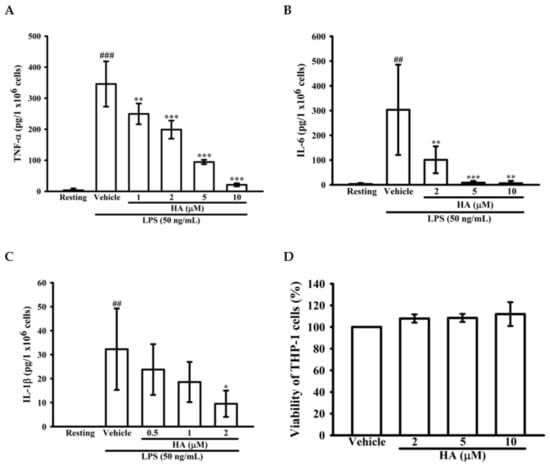 Effect of HA on pro-inflammatory cytokines production induced by LPS in THP-1 cells without cellular toxicity. THP-1 cells (5 × 105 cells/0.5 mL) were dispensed onto 24-well plates and were treated with the indicated concentrations of HA or vehicle for 15 min followed by treatment with LPS (50 ng/mL) for 4 h (A) and 24 h (B,C). Cell-free supernatants were then assayed for the level of TNF-α (A), IL-6 (B) and IL-1β (C) by ELISA. (D) THP-1 cells treated with the indicated concentrations of HA or vehicle for 24 h. Cell viability was quantified by the ability of mitochondria to reduce the tetrazolium dye MTT in viable cells. Data represent means ± S.D. from three independent experiments. ## p < 0.01 and ### p < 0.001 as compared with the resting; * p < 0.05, ** p < 0.01 and *** p < 0.001 as compared with the vehicle.