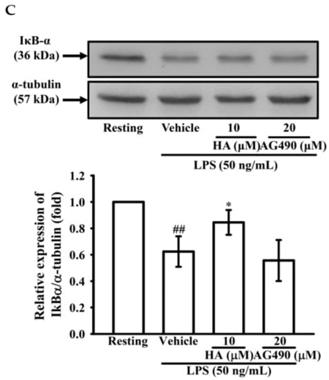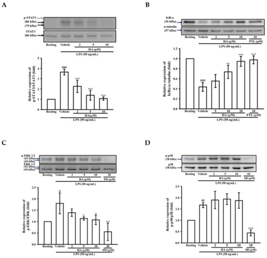 THP-1 cells (1.0 × 106 cells/mL) were seeded into 6-well plate in RPMI 1640/FBS (0.5%) medium were pretreated with or without indicated concentrations of HA for 15 min, followed by stimulation of LPS (50 ng/mL) for the indicated time. Cells were harvested and lysed as previously described [56]. The samples separated by SDS-PAGE and were blotted onto PVDF or nitrocellulose membranes (cat. NO RPN303F and RPN303D, Hybond™, Amersham™, GE Healthcare, Chicago, IL, USA). The blots were probed with the indicated antibodies and then were visualized by using the enhanced chemiluminescence (cat. NO 32106, PierceTM, Thermo Fisher Scientific; Waltham, MA, USA) and exposure to UVP GelDoc-It2 310 Imaging System (Labrepco; Horsham, PA, USA). The images were cropped, formatted, and adjusted for brightness in Adobe Illustrator. The respective fold was analyzed as previously described [56].