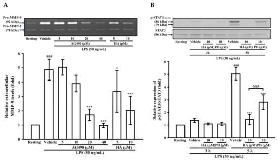 Effect of JAK2-STAT3 cascade inhibition on LPS-mediated MMP-9 expression. THP-1 cells (5 × 105 cells/0.5 mL) were dispensed onto 24-well plates and treated with LPS (50 ng/mL) for 24 h. Cells were treated with the indicated concentrations of AG490 (5, 10, 20, and 40 μM), HA (5 and 10 μM) or vehicle for 15 min before treatment with LPS. Cell-free supernatants were then assayed for MMPs activity by gelatin zymography (A). THP-1 cells (106 cells/mL) were dispensed onto 6-well plates and were treated with LPS (50 ng/mL) for 3 h, 5h (B) and 60 min (C) at the indicated concentrations of HA, PD (10 μM), AG490 (10 μM) or vehicle for 15 min before treatment with LPS. Cell lysates were obtained and analyzed for STAT3 (Tyr705) phosphorylation and IκBα degradation by Western blotting. Data represent means ± S.D. from three to four independent experiments, respectively. ## p < 0.01 and ### p < 0.001 as compared with the resting; * p < 0.05 and *** p < 0.001 as compared with the vehicle; ∆∆∆ p < 0.001 as compared with the group pretreated with HA pre-treatment.