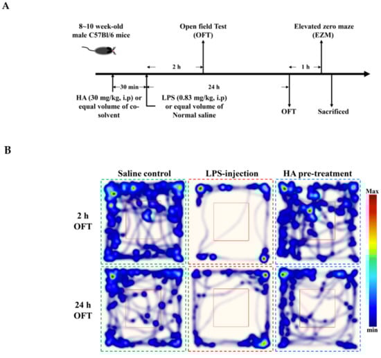 Male C57BL/6 mice (8–10 weeks, 25–28 g) were purchased from bioLASCO, Taiwan Co., Ltd (Taipei, Taiwan). The Institutional Animal Care and Use Committee (IACUC) of Taipei Medical University approved the animal experiments in this study (LAC-2015-0195). To develop mouse endotoxemia models, LPS (E. coli LPS, serotype 0127:B8) was dissolved in pyrogen-free sterile saline (0.9% w/v NaCl) at a concentration of 0.5 mg/mL and intraperitoneally injected at the dose of 0.83 mg/kg of body weight [45]. C57BL/6 mice were assigned to receive a volume of 1.66 mL/kg LPS or an equal amount of normal saline via intraperitoneal injection. For evaluating the effects of HA on the endotoxemia-mediated sickness behavior, anxiety-like behavior and lung inflammation, HA was dissolved in co-solvent as cremophor EL (cat. NO C5135-500G, MilliporeSigma, St. Louis, MO, USA)/ethanol (1:1) and was diluted (1:10) with pyrogen-free sterile saline (0.9% w/v NaCl), and intraperitoneally administered 30 min before LPS-injection at 30 mg/kg of body weight. Animals were randomized into three experimental groups (n = 7) for behavioral and biochemical assessment. The group III (HA group) were intraperitoneally administrated with HA, and the group I (Saline control group) group II were injected with an equal volume of vehicle (co-solvent) before LPS injection. After 30 min, the group I challenged with Saline, group II and group III challenged with LPS (0.83 mg/kg, i.p.), respectively. LPS-mediated behavior impairments were assessed by OFT and EPM 2/24 h and 25 h, respectively, post-LPS or saline challenge. Animals were continuously monitored for 26 h. At the end of the above behavioral test, the mice were sacrificed and the target organs were harvested.