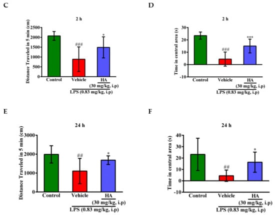 Effect of HA on sickness behavior in the open field test following a systemic LPS challenge. (A) Experimental timeline and design. (B) Heat-map represented the tracks of mice in the different groups in OFT, red = more time, blue = less time. (C) Total distance traveled 5 min in the different groups administrated with sterile saline or LPS (0.83 mg/kg, i.p) for 2 h. (D) Percentage of time spent in 5 min in the open area in the different groups for 2 h. (E) Total distance traveled 5 min in the different groups challenged with sterile saline or LPS (0.83 mg/kg, i.p) for 24 h. (F) Percentage of time spent in 5 min in the central area in the different groups for 24 h. Data represent group means ± S.D., n = 7 mice/group. ## p < 0.01 and ### p < 0.001 as compared with the saline control group (Control); * p < 0.05 and *** p < 0.001 as compared with the co-solvent group (vehicle).