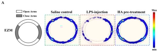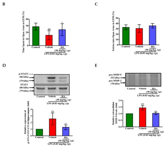 Body weight loss, acute motor deficits, and anxiety-like behavior are typical sickness behaviors that are mediated by systemic immune responses [28]. As indicated in Figure 5A, the 5-min period of OFT after LPS-injection for 2 h and 24 h, respectively, were presented using heat-maps. The total distance traveled by LPS-challenged mice was dramatically reduced by 57% compared to control mice (Saline-2073.0 ± 224.9 vs. LPS-888.9 ± 625.5, p < 0.001). HA (30 mg/kg) pretreatment significantly prevented LPS-induced acute locomotor deficits compared to the LPS-challenged group at 2 h (Figure 5C, p < 0.05). As shown in Figure 5D, the LPS-injected mice group spent significantly less time in the open area than the control group (p < 0.001). HA pretreatment significantly lessened the LPS-induced reduction in the time spent in the open area (p < 0.001). One day after LPS injection, HA pretreatment still significantly improved the reduction of the time spent in the open area and the total distance traveled induced by LPS-injection (p < 0.05, Figure 5E,F). Also, pretreatment reduced body weight loss and body temperature abnormalities mediated by LPS at 24 h compared with the LPS-challenged group (Figure S6A,B). As shown in Figure 6 A, the 5-min period of the EZM tests were tracked as a Heat-map at one day after the LPS injection. As shown in Figure 6B, the percentage of entries in the open quadrants was significantly lower in the LPS-challenged group than in the control group (p < 0.01). HA-pretreatment significantly lessened the decline of time spent in the open quadrants compared to the behaviors observed in the LPS challenge group (p < 0.05). A slight decrease in the percentage of entries in the open quadrants was observed in the LPS challenge group compared to the control group, but no significant differences were observed among the 3 groups (p > 0.05, Figure 6C). To further determine whether HA pretreatment regulated STAT3 activation and pro-MMP-9 expression in the hippocampus during endotoxemia-mediated acute sickness behavior and anxiety-like behavior, the expression levels of phosphorylated STAT3 (Tyr705) and pro-MMP-9 expression were evaluated by immunoblotting and gelatin zymography, respectively. Compared with the control group, LPS significantly increased the expression levels of STAT3 phosphorylated on Tyr705 in the hippocampus to 2.55 ± 0.90 fold. The increase in phosphorylated STAT3 protein levels was reduced by HA pretreatment to 50% as compared with the LPS-challenged group (LPS-2.55 ± 0.90-fold vs. HA-1.29 ± 0.37 fold, p < 0.01) (Figure 6D). Additionally, zymography showed that sample of hippocampus post-LPS challenged significantly enhanced MMP-9-mediated gelatinolysis by up to 1.44 ± 0.17-fold, and pretreatment with HA significantly attenuated MMP-9-mediated gelatinolysis by 28% as compared with the LPS-challenged group (LPS-1.44 ± 0.17-fold vs. HA 1.03 ± 0.09, p < 0.01) (Figure 6E). Furthermore, LPS injection significantly increased the number of CD68+ phagocytes in the CA3 hippocampal region compared with the control group. Compared with the septic group, the pretreatment of HA reduced the infiltration of CD68+ phagocytes (Figure S7).