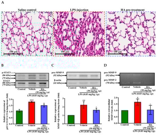 Pulmonary edema caused by Gram-negative bacterial infection is the primary manifestation of organ failure and the most common cause of sepsis-related death [29]. It has been reported [30] that STAT3 blocker inhibits the LPS-mediated inflammatory response in mice with acute lung injuries (ALI). One day after intraperitoneal injection of LPS (0.83 mg/kg), histology image analysis was done to assess the effect of HA pretreatment on endotoxemia-mediated lung injury. As shown in Figure 7A, LPS induced pathologic lung injury, including interstitial tissue edema, infiltration of inflammatory cells, and alveolar collapse, which were reduced in the HA-pretreated group compared to the LPS-challenged group. Furthermore, LPS significantly augmented the expression levels of phosphorylated STAT3 (Tyr705) in lung tissue compared to the control group, and HA pretreatment reversed the upregulation of STAT3 phosphorylation induced by LPS (Figure 7B). On the other hand, one day after LPS was challenged, the protein levels of MMP-9 were significantly increased, and pretreatment with HA significantly attenuated the MMP-9 expression induced by LPS of the lung tissues (Figure 7C). Notably, BALF collected from mice injected at one day after LPS treatment also showed an increase in the MMP-9-mediated gelatinolysis by 1.65 ± 0.25 fold compared to control mice. The pretreatment of HA significantly reduced MMP-9 activity in BALF collected from the HA group compared with the LPS-challenged group (LPS-1.65 ± 0.25-fold vs. HA-1.04 ± 0.36 fold, p < 0.05) (Figure 7D).