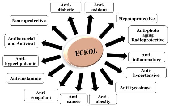 Therefore, understanding the biological activities of eckol to expand effective therapeutic approaches is very important. Although abundant information related to compounds from marine algae [5,30,31,32], seaweed [6,33,34,35,36,37,38], and phlorotannins from seaweeds [10,39,40] is accessible, little information is available about this particular type of phlorotannin. Therefore, this review summarizes the biological characterization and pharmacological bioactivity of eckol, focusing on recent advancements related to this particular compound.