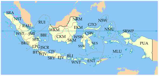 Figure 1. Map of Indonesia and its 34 provinces [15]: SRA (Special Region of Aceh), NST (North Sumatra), RAU (Riau), RUI (Riau Islands), WST (West Sumatra), JMI (Jambi), BKU (Bengkulu), SST (South Sumatra), BBI (Bangka–Belitung Islands), LPG (Lampung), BTN (Banten), JSCR (Jakarta Special Capital Region), WJV (West Java), CJV (Central Java), SRY (Special Region of Yogyakarta), EJV (East Java), BLI (Bali), WNT (West Nusa Tenggara), ENT (East Nusa Tenggara), WKM (West Kalimantan), CKM (Central Kalimantan), EKM (East Kalimantan), SKM (South Kalimantan), NKM (North Kalimantan), NSW (North Sulawesi), GTO (Gorontalo), WSW (West Sulawesi), CSW (Central Sulawesi), SSW (South Sulawesi), SES (Southeast Sulawesi), NMU (North Maluku), MLU (Maluku), SRWP (Special Region of West Papua), and PUA (Papua).