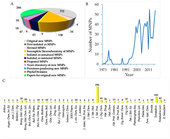 Figure 3. Statistics of new Indonesian MNPs from January 1970 to December 2017 (A). Distribution of new MNPs on the basis of their publication per year (B) and journal titles (C).