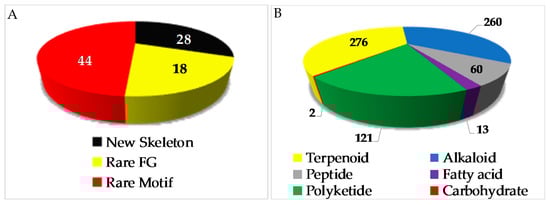 The chemical diversity of Indonesian MNPs has been analyzed with respect to carbon skeleton, functional group, rare motif, and atomic diversity. New carbon skeletons were observed in 28 molecules, while rare FGs and motifs were found in 18 and 44 molecules, respectively (Figure 4). A few examples of new carbon skeletons can be seen in vannusal A (198), halioxepine (281), manadomanzamine A (318), and phormidolide (702), while rare FGs and motifs can be seen in sinulasulfone (44), polycarpaurine C (487), siladenoserinol A (505), lanesoic acid (541), and petroquinone A (734), to name a few. In this review, the MNPs are organized into their structural types, consisting of 276 terpenoids (37.7%), 260 alkaloids (35.5%), 60 peptides (8.2%), 13 fatty acids and linear molecules (1.8%), 121 polyketides (16.5%), and 2 carbohydrates (0.3%) (Figure 4B). Among 97 chemical types of Indonesian MNPs, piperidine alkaloids (48 molecules), tyrosine alkaloids (38 molecules), indole alkaloids (37 molecules), aromatic polyketides (34 molecules), and quinones (33 molecules) are listed as the top five chemical types (Figure 4C).