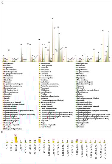The evaluation of atomic diversity within Indonesian MNPs (Figure 4D) shows that 27 molecules (written in red numbers) contain 6 different atoms in 1 molecule, while the majority (326 molecules) contain 3 different atoms in 1 molecule. Most of them contain C, H, O, N, with the addition of Br and I (4 molecules), as in enisorine E (438), agelanesins B (464) and D (466), 1-O-methylhemibastadinol 4 (440); Br and Cl (1 molecule), as in diazonamide E (611); Br and S, as in mauritamides D (462), B (467) and C (468); Cl and S (4 molecules), as in dysithiazolamide (552), biakamides A–D (742745); P and S (12 molecules), as in siladenoserinols A–L (505516); Na and S (1 molecule), as in cupolamide A (564). Of 732 molecules, 373 (51.0%) are nitrogenous molecules. Further inspection of the atomic diversity indicated that 122 molecules (16.7%) possess a ratio of H/C < 1, which is often challenging with respect to structure elucidation [31]. The smallest H/C was found in cadiolide B (679) (H/C = 0.4). In terms of molecular weight, the biggest MNP is kakelokelose (747), with an estimated molecular weight of between 3 and 500 kDa, while the smallest MNP was plakofuranolactone (683), at 172 Da. The biggest unsaturation number (Un) 43 of petroquinones A (734) and B (735) is composed of 16 rings and 27 double bonds, while the smallest is 1 in strepsiamides A–C (518520).
