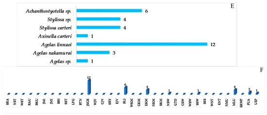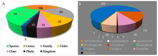 With respect to phylogeny, new MNPs have been discovered from 5 kingdoms, 10 phyla, 14 classes, 32 orders, 64 families, 106 genera, and 94 species (Figure 5A,B) in Indonesian waters over the past 47 years. Three phyla (Porifera, Cnidaria, and Chordata) are found to be the major sources (498 molecules, 68.0%; 116 molecules, 15.8%; and 60 molecules, 8.2%, respectively) of novel metabolites. The remaining 8.0% were discovered from the following phyla: Mollusca (3 molecules, 0.4%), Rhodophyta (3 molecules, 0.4%), Ciliophora (2 molecules, 0.3%), Dinoflagellate (2 molecules, 0.3%), Ascomycota (45 molecules, 6.1%), Cyanobacteria (1 molecule, 0.1%), and Actinobacteria (2 molecules, 0.3%). The phylum Porifera, the largest source of Indonesian MNPs, consists of three classes: Demospongiae (91.8%), Homoscleromorpha (6.6%) and Calcarea (1.6%). Among these, Demospongiae is comprised of 11 orders and 32 families. The Cnidaria is comprised of 1 class (Anthozoa), 3 orders (Alcyonacea, Pennatulacea, Actinaria), and 9 families (Alcyoniidae, Nephtheidae, Xeniidae, Briareidae, Ellisellidae, Isididae, Veretillidae, Pennatulidae, and Stichodactylidae).
