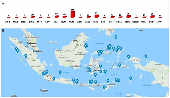 Figure 8. Distribution of new Indonesian MNPs on the basis of their biogeography hotspots (A,B) (OPV other provinces).