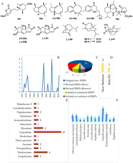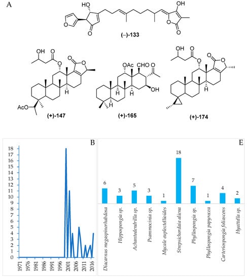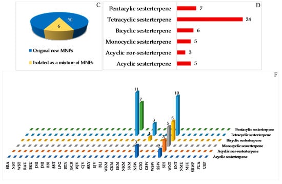 Figure 12. Structures of marine sesterterpenoids from Indonesian waters found in 1970–2017: (A) representative. Distribution of new marine sesterterpenoids by year (B). Statistics of new marine sesterterpenoids (C). Distribution of new marine sesterterpenoids on the basis of their skeletons (D), biological sources (E), and biogeography (F).