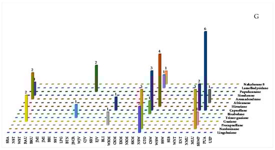 Figure 9. Structures of marine sesquiterpenoids from Indonesian waters found in 1970–2017 (A): representative. Distribution of new marine sesquiterpenoids by year (B). Statistics of new marine sesquiterpenoids (C). Distribution of new marine sesquiterpenoids on the basis of their skeletons (D,E), biological sources (F), and biogeography (G).