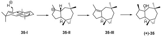 The first sesquitepenoid found in Indonesian waters was africanol (35) from Lemnalia africana and Lemnalia nitida, collected off Tanimbar, MLU. Its structure, including AC, was established by X-ray analysis [59] and confirmed by total synthesis [60,61]. It was proposed that 35 was derived from a humulene through its CT (cross and parallel rearrangements of two double bonds) conformer 35-I, which undergoes acid-catalyzed closure to the 9-africyl cation 35-II, followed by proton loss and hydration to provide 35 (Figure 10). Africanol (35) showed toxicity against guppy Lebistes reticulatus and unicellular algae Chaetoceros septentrionalis, Astrionella japonica, Thallasioscira excentricus, Protocentrum micans, and Amphidinium carterae [62].