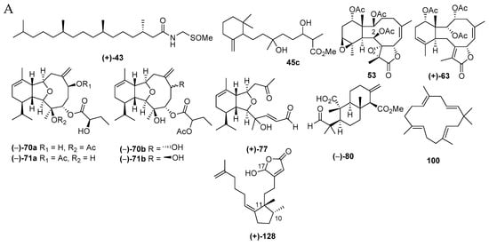 Diterpenoids are molecules more frequently found from Cnidarian (56 molecules, 66.7%), particularly Alcyonacea (57.1%), than from Porifera (28 molecules, 33.3%). The diterpenoids found in Indonesian waters from January 1970 to December 2017 are compiled in Table S2 in the Supplementary Materials, Figure 11A and Figure S2. As for sesquiterpenoids, initial studies on diterpenoids were performed in 1970s, and publication increased after 1996 (Figure 11B). All of these efforts resulted in 84 new, 2 revised, 1 derivative, and 1 known but first from marine (Figure 11C). Among the new molecules, 4 have new skeletons, 80, 100, 117, and 128 (Figure 11D), 2 molecules contain rare FGs, sulfoxide or sulfone, and 5 molecules are listed to possess a rare structural motif, 77, 79, 113, 119, and 124 (Figure 11D). The chemical diversity of Indonesian marine diterpenoids (84 molecules) was proved, as there were 15 different skeletons: 19 spongianes, 18 each of briaranes and cembranes, 7 cladiellanes, 6 xenicanes, 3 each of nor-cembranes and acyclic peroxide diterpenes, 2 each of copalanes and acyclic diterpenes, and 1 each of niphatane, flexibilane, seco-cladiellane, dollabelane, isocopalane, and seco-isocopalane (Figure 11F). Four molecules, 101, 108, 110, and 112, were determined by X-ray analysis. ECD was used to reveal the ACs of 8 molecules, 43, 44, 79, 82, 88, 89, 90, and 128. In particular, 5 molecules, 82, 8890 and 128, were elucidated by comparing actual spectra and calculated ECD. The modified Mosher’s method was applied for 8 molecules, 5457, 63, 70a, 113, and 124. Two molecules, 70a and 71a, were revised to 70b and 71b. NSW is the most favored place for finding new marine diterpenes (41 molecules, 48.8%), followed by MLU (10 molecules, 11.9%) (Figure 11H). One molecule, 45c, was isolated as a derivative, while molecule 53 was isolated as a natural product for the first time, but was previously known as a semisynthetic.