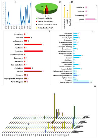 Figure 11. Structures of marine diterpenoids from Indonesian waters found in 1970–2017 (A): representative. Distribution of new marine diterpenoids by year (B). Statistics of new marine diterpenoids (C). Distribution of new marine diterpenoids on the basis of their skeletons (D,F), significant biological activity (E), biological sources (G), and biogeography (H).