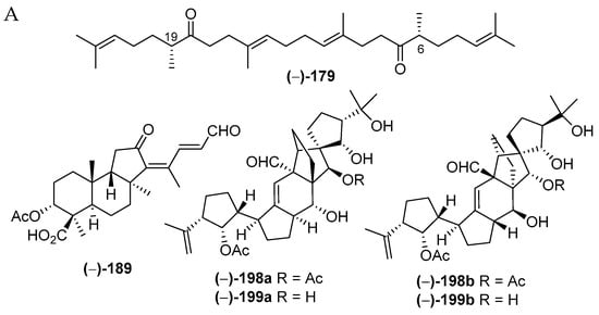 Indonesian marine triterpenoids (Table S4 and Figure 13A, Figure S4) are comprised of 21 new, 7 mixtures, 1 derivative, and 2 revised molecules (Figure 13C). The triterpenes are grouped into three structural classes: squalane (1), isomalabaricanes (18) and vannusanes (2 molecules). Of 21, only vannusals A (198) and B (199) were found to have a new skeleton. The 3 skeletons were obtained from 3 species, Euplotes vannus for 198a and 199a, Rhabdastrella globostellata for 180197, and Hyrtios erectus for 179 (Figure 13C,D). The AC of 1 molecule, 199b, was solved by X-ray analysis. Of the triterpenoids, six were found to show significant cytostatic activity. The metabolites were mainly isolated from specimens collected in SSW (12 molecules) (Figure 13F). Two molecules, 198a and 199a, were revised to 198b and 199b [36,37,38,39,40,41]. The stereochemistry of vannusal B (199b) was also examined by density functional theory (DFT) calculation [42]. A plausible biosynthetic pathway of vannusals A (198b) and B (199b) was proposed (Figure 14) [43].
