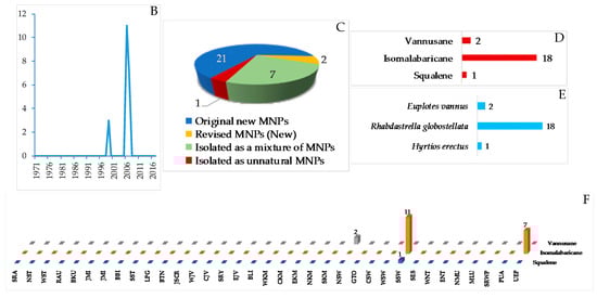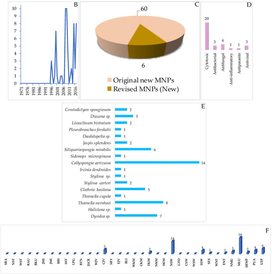 Figure 13. Structures of marine triterpenoids from Indonesian waters found in 1970–2017: (A) representative. Distribution of new marine triterpenoids by year (B). Statistics of new marine triterpenoids (C). Distribution of new marine triterpenoids on the basis of their skeletons (D), biological sources (E), and biogeography (F).